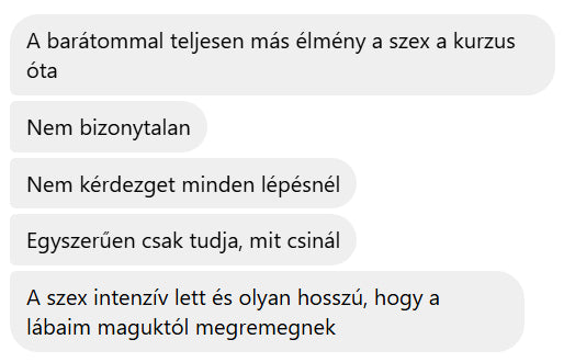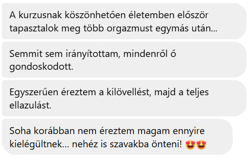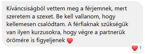 Ahelyett, hogy hónapokon át pornóból tanulnál, kapkodva cselekednél és az internetről származó ellentmondásos tanácsokra hagyatkoznál, bevált módszereket kapsz, amelyeket már több ezer résztvevő alkalmazott sikerrel, és akik már most élvezik az intim életüket.